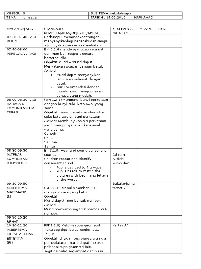 March 12th 2019 - Pra Sekolah Selamat datang ke blog prasekolah Blog ini membekalkan rancangan pengajaran harian aktiviti pembelajaran. 13 - Mendengar dan mengecam perbezaan bunyi perkataan. Modul Bertema merupakan modul bersepadu yang merangkumi unsur-unsur dalam keenam-enam Tunjang dan juga unsur kreatif kritis dan inovatif.
